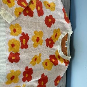Chic crew neck sweater by Storia. Features vibrant orange and pink floral patterns on a white base. Perfect for casual outings.