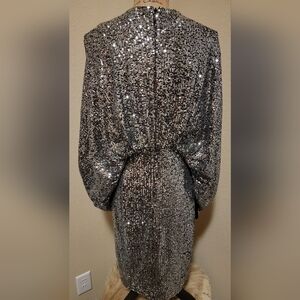 Stunning New Gabrielle Union silver sequin midi dress. Features a deep V-neck and long sleeves. Perfect for evening events.