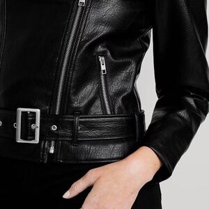 Old Navy Black Faux Belted Leather Moto Jacket. Size M. Elevate your style with this sleek black leather jacket. Perfect for any occasion, it offers both comfort and edge. A must-have addition to your wardrobe.