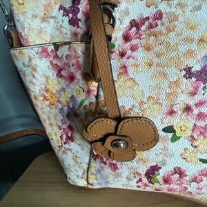 Dana Buchman Floral Handbag, often described as a tote or crossbody satchel. Features a vibrant floral pattern on a light background, often described as cream, white, or ivory with multi-colored (pink, yellow, purple) flowers.