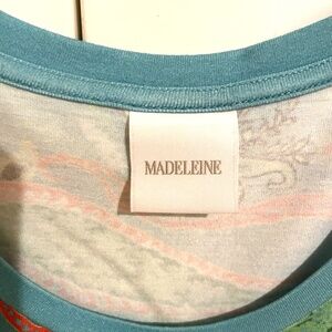 This is a charming, German-made blue paisley size XL top from the brand Madeleine. It is 95% viscose and 5% elastane/spandex.