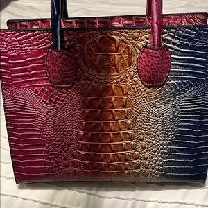This stylish tote bag features a stunning crocodile-embossed design in a blend of vibrant colors. Perfect for adding a pop of color to any outfit.