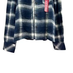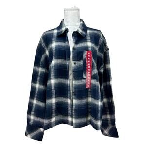 New with tags Scotch & Soda cropped flannel shirt in a soft blue and white plaid. Made from 100% cotton, this premium button‑front top blends modern streetwear with classic flannel comfort. Features a slightly cropped silhouette, long sleeves, structured collar, and high‑quality construction. Size XL.