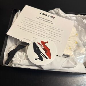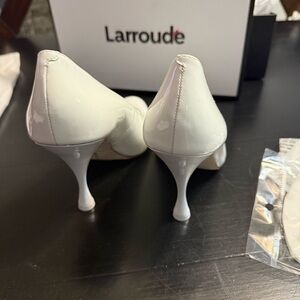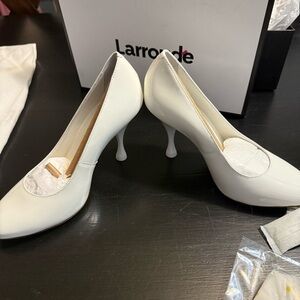 Elegant Larroude shoes. They are new in the box complete with a dust bag for each shoe and pads for the bottom of the heels. My daughter bought these for her wedding, but ended up realizing she cannot walk in heels.