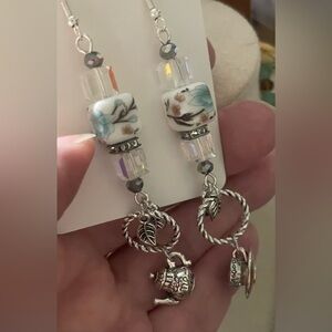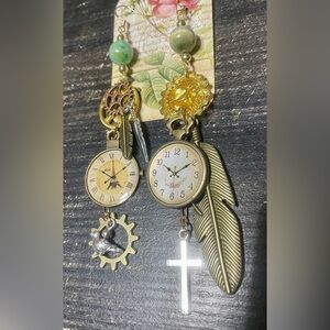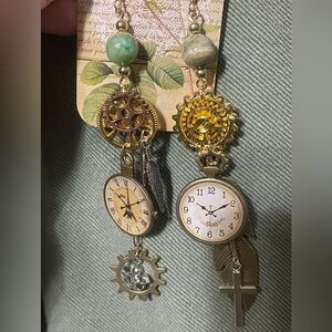 Unique hand crafted earrings featuring clock faces, gears and feather charms. Accented with gold and silver tones.