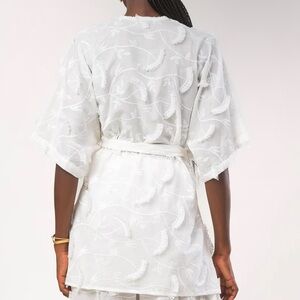 Elegant white coverup with intricate embroidery. Features a tie waist and short sleeves. Perfect for beach or poolside.