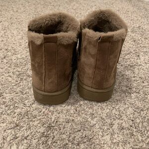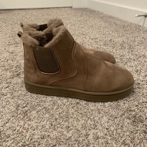Stylish brown suede ankle boots featuring a cozy fur trim. Perfect for casual wear.
