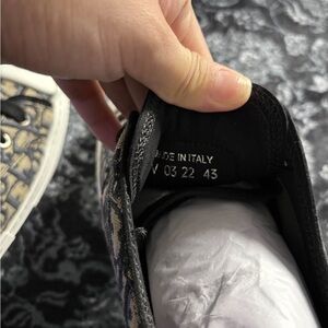 Stylish Dior men's shoes. Black laces and cream accents. Iconic pattern design.