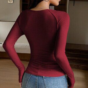 Add a retro‑inspired flair to holiday outfits with this burgundy Y2K Christmas top. A square neck frames the face while long sleeves keep the look modest and season‑ready. The slim‑fit lace corset detailing offers subtle structure, and the regular length works for layered styling or solo wear. Perfect for casual celebrations, this piece blends vintage charm with modern comfort.