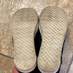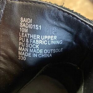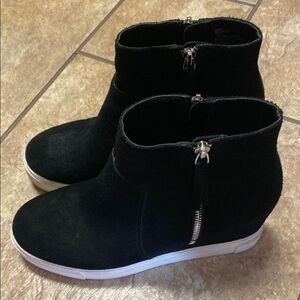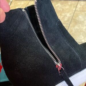 Sadi Step out in style with these chic black suede ankle boots with white soles. Perfect for any occasion, these boots offer both comfort and elegance. Size 10 Medium Leather uppers. Double sided zippers Slight flaw on top of toe area of one otherwise Good condition