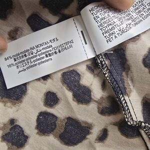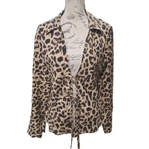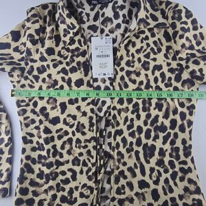 A chic leopard print blouse by Zara. This collared shirt features a flattering tie-front closure and elegant long bell sleeves. Its versatile design makes it perfect for a night out or a stylish brunch.