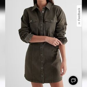 Express Denim Fitted Mini Shirt Dress, NEW, Size S, green, buttons up front, front pockets, button sleeves, cotton spandex blend material, new no tags, machine washable, arm pit to arm pit 21.5", sleeve length from shoulder to cuff 25", length from shoulder to hem 34"
