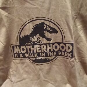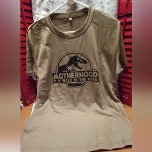 humorous 'Motherhood is a Walk in the Park' graphic. showing jurassic park logo.. Perfect for casual outings, this green shirt offers comfort and a playful design.