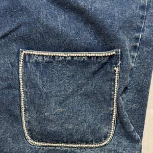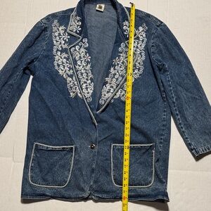 Stylish denim jacket with intricate white embroidery. Perfect for adding a touch of elegance to your casual look.