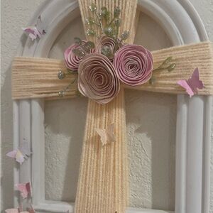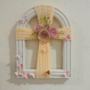 Materials YARN WATERCOLOR PAINT AND PAPER- CARSTOCK AND FAUX GREENERY hand crafted cross flowers and butterflies
