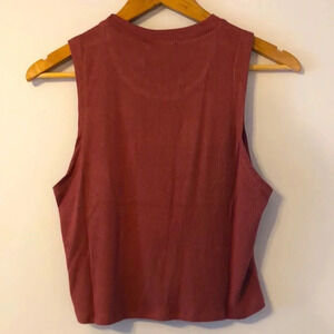 Soft and stylish Olivaceous sleeveless knit top in a warm rust color. Features a relaxed fit with wide armholes and a classic crew neckline. Lightweight and comfortable—perfect for layering or wearing on its own during warmer weather.