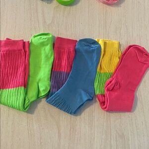 Bright socks in pink, blue, green, and yellow with matching triangle earrings. Perfect for a bold look.