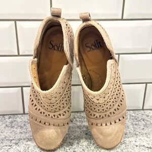 Keywords: Söfft booties, womens ankle boots, wedge heel boots, laser cut boots, suede booties, taupe boots, casual booties, fashion ankle boots, size 8M, bohemian boots, designer ankle boots, Söfft shoes, womens footwear