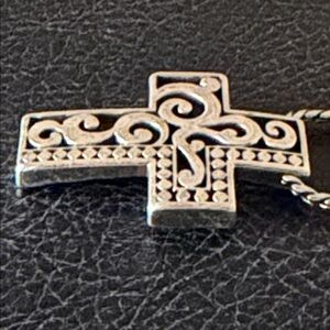 The influences of fine Balinese jewelry artistry are reflected in intricate scrollwork in this silver plated cross. Each Brighton jewelry piece is cast in solid brass or zinc alloy and is plated in pure silver. Since silver has a natural tendency to tarnish (oxidize) and scratch, a protective layer of lacquer is added. Amazing condition, lots of TLC. Beautiful cross on necklace with link extender. Lobster claw closure (clasp works perfectly). Barely signs of “wear” in parts of cross (same has been professionally steamed and polished). Box and new cloth are included. Gift(s) included with purchase. Should you have any questions, please do not hesitate to ask. Thanks for visiting my closet. 💐