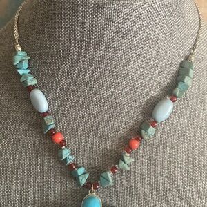 Vintage AVON Turquoise Chips and Tiny Coral Beads Enamel Flower Pendant Necklace Elegant necklace featuring a turquoise and coral flower pendant. Perfect for adding a pop of color to any outfit. 15.75” inch 3”inch extension 2.25” inch drop pendant