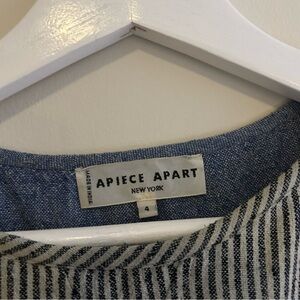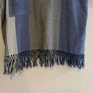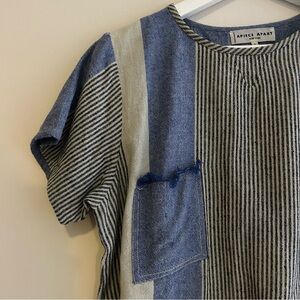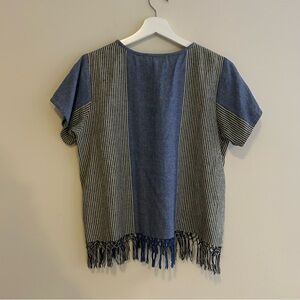 Apiece Apart Navy Blue White Stripe Top Boho Fringe Silk Contrast Short Sleeve