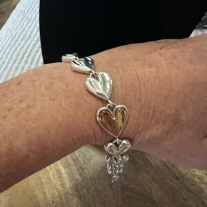Elegant bracelet featuring alternating silver and gold heart charms. Perfect for adding a touch of sophistication to any outfit.