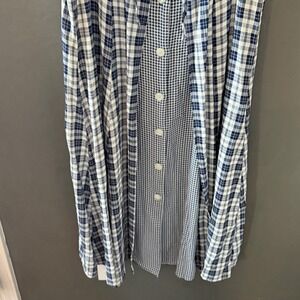 Vintage-inspired maxi dress features a charming mixed-pattern design with a large blue and white plaid outer layer over a smaller gingham print button-down front. The sleeveless silhouette is accented by a deep V-neckline and a front tie detail at the waist for a flattering, adjustable fit. Crafted from a lightweight, breathable fabric, this piece offers a relaxed yet polished aesthetic perfect for garden parties or casual summer outings.