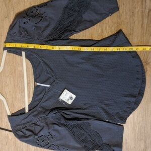 Cotton 5/6 length sleeves feature open-work embroidery & crocheted lace. The body is constructed from swiss dot stretch cotton blend. This versatile style fits snug on most and can be worn dressed up or down.