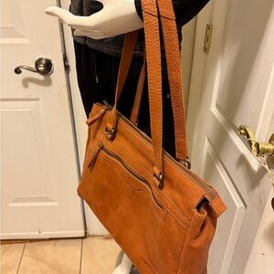 Elevate your everyday carry with this stunning Spikes & Sparrow leather tote bag. The rich cognac color and beautifully distressed leather feel both classic and modern, a look that speaks directly to a sense of effortless style. The thoughtfully designed interior, with a padded laptop sleeve and multiple pockets, gives you an intuitive way to organize your life, so you can move through your day with a sense of calm and confidence. This bag isn't just an accessory; it's a feeling of professional sophistication and functional elegance. You will find yourself reaching for this bag for years to come. This stylish tan leather handbag is perfect for any occasion. Its sleek design and durable material make it a must-have accessory.