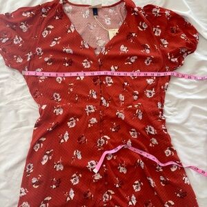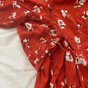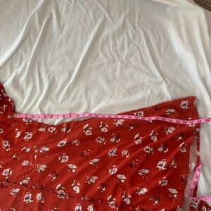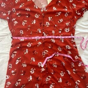 Stylish red midi dress with floral pattern. Features a flattering V-neck and short sleeves. Perfect for casual outings.