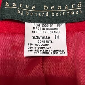 Thus Harve Benard by Benard Holtzman Red Wool Blend Cashmere Blazer Jacket is ABSOLUTELY GORGEOUS!!! Size 14. Featuring; 4 Button Front Closure. Long sleeves, notch collar, lined & 2 front flap pockets. 65% Wool, 25% Nylon & 10% Recycled Cashmere. Measurements laying down flat & buttoned to measure: Pit to Pit: 21.0”. Pit to end of sleeve: 17.5”. Nape to hem: 24.5”