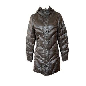 Keywords: KJUS, puffer coat, down jacket, hooded jacket, womens coat, extra small, brown coat, winter coat, lightweight jacket, goose down, padded coat, quilted jacket, chevron, casual outerwear