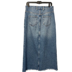 Chic denim maxi skirt with front slit. Frayed hem adds casual flair. Ideal for versatile styling.