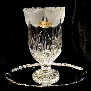 Vintage Block tulip hurricane candle holder vase. Crafted from high-quality block lead crystal, this piece features a clear color and a stunning tulip floral pattern that will surely impress guests. The versatile design allows it to be used as a vase or a candle holder, making it a perfect addition to any home decor.