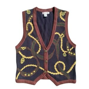 Vintage Talbots sweater vest in a rich navy blue and burgundy color palette. This button-front knit features an intricate equestrian-inspired pattern with golden rope, chain, and crest motifs.