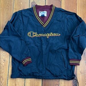 Vintage Champion black pullover windbreaker with maroon and gold accents. Features logo on front.