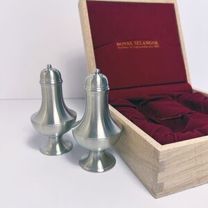Brand new in beautiful wooden box, set of vintage Royal Selangor pewter salt and pepper shakers
