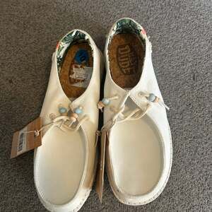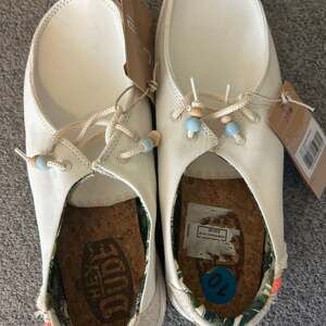 Brand New Hey Dude Wendy Fringe Slip-On Shoes in Salt. These lightweight loafers feature a canvas upper with decorative wood and turquoise-colored beads on the laces. The interior boasts a tropical floral lining and a comfortable cork insole. Tropical fringe detailing on the heel adds a unique, beachy vibe.