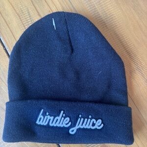 Stylish black beanie with 'birdie juice' embroidery. Perfect for casual wear.