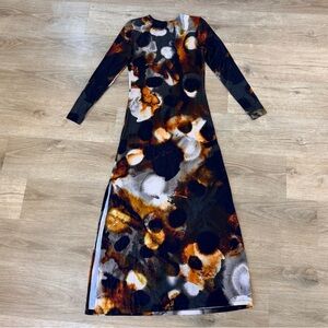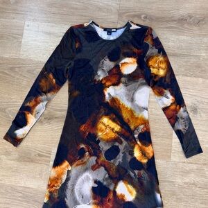 Bold long sleeve dress with striking orange and black pattern. Perfect for a stylish statement.