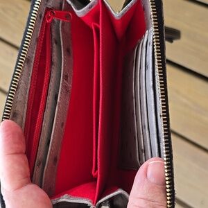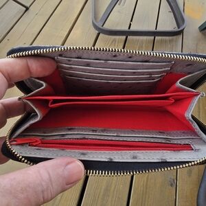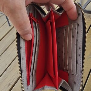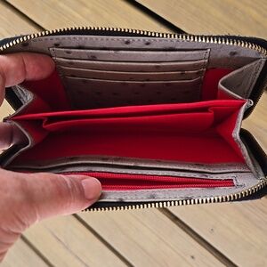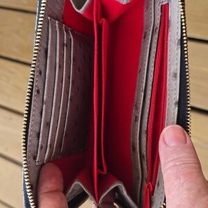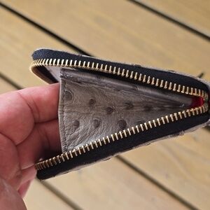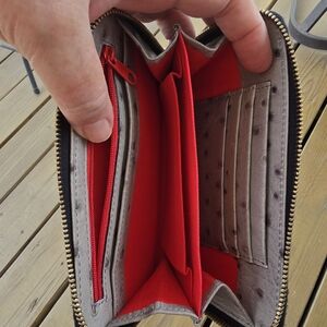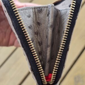 Elegant gray wristlet with ostrich texture. Gold-tone logo plate and zipper. Includes detachable strap.