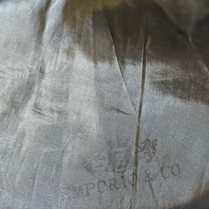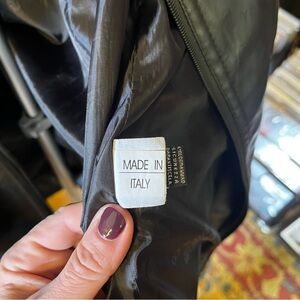 Excellent pre-loved condition vintage black leather moto jacket. Made in Italy. Silky interior with inside pocket. Mock neck with button snap. Emporio & Co. emblem on left chest. The sleeves have double snaps for adjustable size closure.