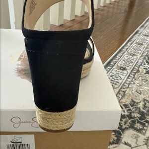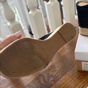 Elegant black wedges with a tan espadrille sole. Perfect for adding height and style.