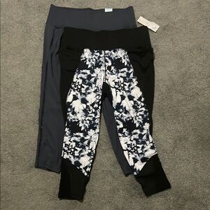 Stylish leggings with a black and white floral pattern. As well as a navy/blueish pair with tag. Perfect for workouts or casual wear.