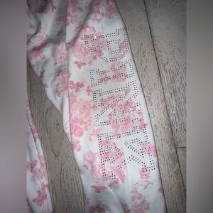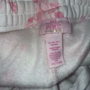 Like New Victoria’s Secret PINK x LoveShackFancy wide-leg sweatpants from the exclusive limited-edition collaboration. These cozy, fleece-lined lounge pants feature girly details including floral accents and bow-inspired design elements. Relaxed, roomy fit with a wide shirred elastic waistband and ribbon drawstring for comfort. Finished with side pockets, graphic detail at the hip, PINK logo at the lower leg, and raw-edge hem. Perfect paired with the matching PINK x LoveShackFancy oversized crew sweatshirt.