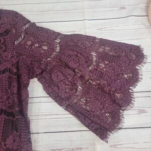 In excellent condition, this maroon knee-length dress features short sleeves and delicate lace detailing.
