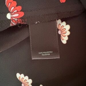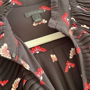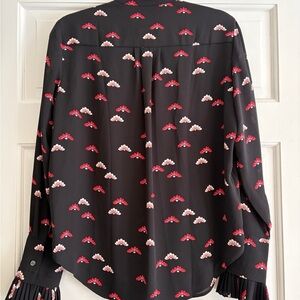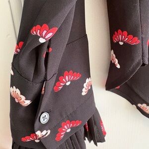 Chic black blouse featuring ruffled front. Adorned with a delicate floral design. Ideal for versatile styling. Clasp closure on front.