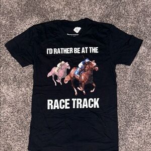Black tee featuring a horse racing graphic with text 'I'd Rather Be At The Race Track'.