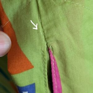 No stains. All seams intact. Washed. Essentially no evidence of wear - bright colors, no pilling. The only thing I saw was a tiny fray at the pocket seam, shown in close-up.