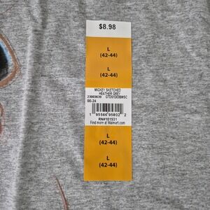 Identifiers on tags: Interior Disney 100 printed neck label marked L/G/G (42/44) with RN# 115931, size L (42-44), and product description MICKEY SKETCHED HEATHER GREY with additional codes 23003839, 0024, and GTD530BMISC.